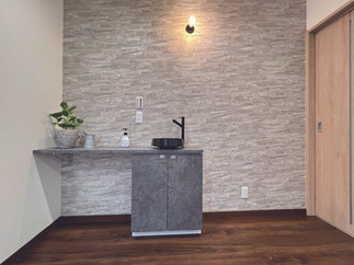 帰宅後の手洗いがルーティーンになる玄関ホールの洗面台。